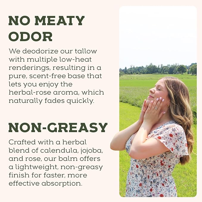 - No Meaty Odor: Experience the benefits of beef tallow for skin without the harsh odor. Our proprietary steam-distilled beef tallow for face and skin, ensures the highest nutritional value without the typical meaty smell.