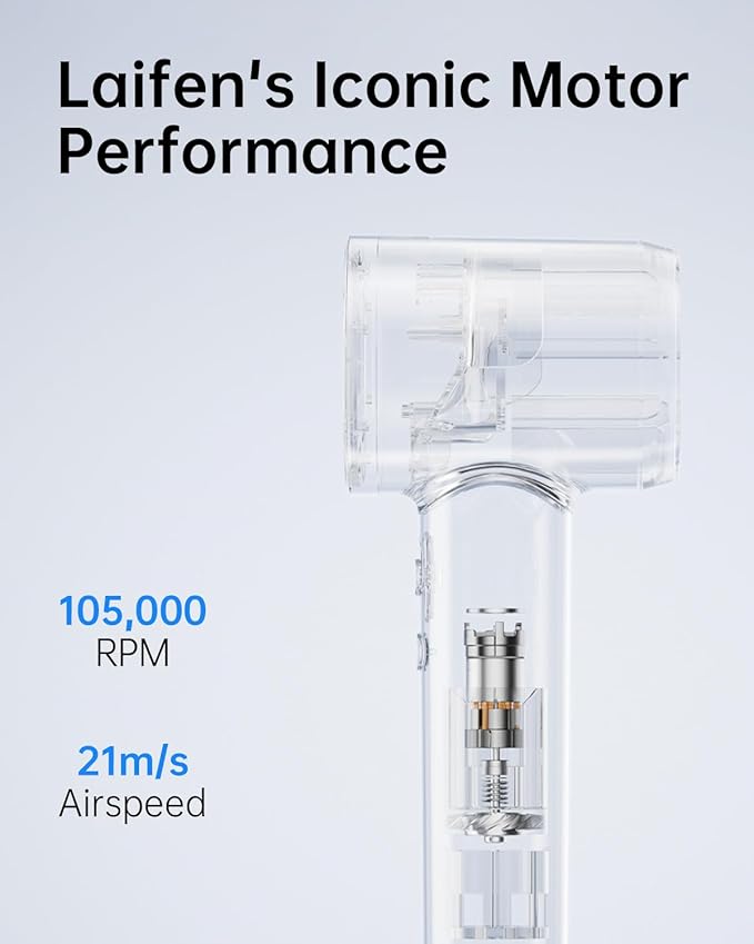 - [Fast Drying] Laifen hair dryer is equipped with a high speed,105,000 rpm brushless motor with wind speed of 21m/s. Strong airflow can dry hair in a short time, speed up your routine